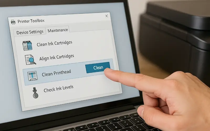 ساده ترین و امن ترین راه برای رفع این مشکل، استفاده از قابلیت داخلی خود چاپگر است. تقریباً تمام چاپگرهای جوهرافشان امکان پاک سازی خودکار هد را دارند. مسیر انجام آن معمولاً به این شکل است: