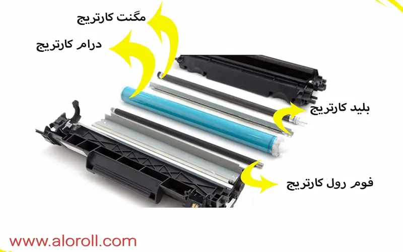 قطعات اصلی کارتریج شامل درام (Drum)، تونر یا جوهر، بلید تمیزکننده، مگنت رولر، داکتر بلید و چیپ هوشمند است. هر یک از این اجزا نقشی کلیدی در فرآیند چاپ دارند؛ مثلاً درام تصویر را روی کاغذ منتقل میکند، تونر ماده اصلی چاپ است و چیپ، میزان مصرف را کنترل میکند. کیفیت هر قطعه مستقیماً بر وضوح و دوام چاپ تأثیر میگذارد.